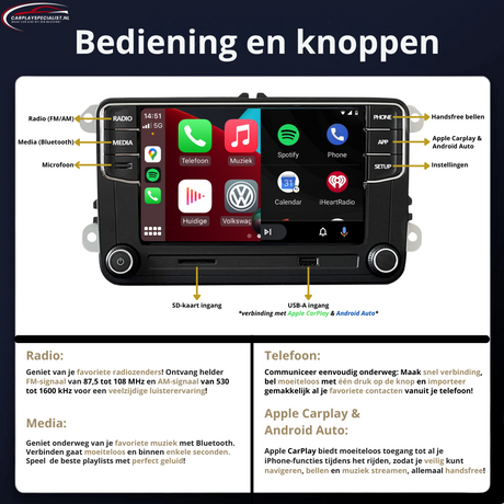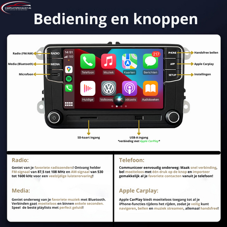 Bent u op zoek naar een hoogwaardige autoradio die Apple CarPlay en Bluetooth ondersteunt? Zoek niet verder! De RCD 360 Apple CarPlay maakt uw Volkswagen-interieur compleet en stelt u in staat om moeiteloos handsfree muziek te luisteren, te navigeren en te bellen. Deze radio is tevens de ideale vervanging voor de RCD 510, RNS 510, RCD 300, RCD 310 en RNS 310.