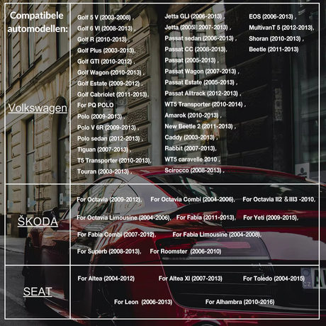 Als uw auto valt binnen de compatibele bouwjaren en uitvoeringen – zoals de Golf 5, Golf 6 (in diverse varianten), Jetta, Passat, Tiguan en andere – dan is dit product perfect afgestemd op uw auto.